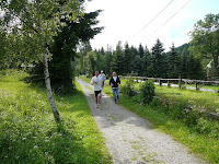 Banges Warten für mich auf Christoph. Die Zeit verging und keiner war zu sehen. Knapp 4min später tauchte er auf und ich konnte endlich losflitzen. Allerdings ging es erst mal steil bergab. Richtig STEIL! Der eigentlich gesperrte Skihang war die Strecke für die nächsten knapp 2km. Rollen lassen ging nicht. Die Wiese war extrem rutschig und der Streifen in der Mitte übersäht mit Schotter und Geröll. 2-3mal war ich kurz vorm Abflug. Dann Asphaltpassage. Die Radbleitung der Elbtalflitzerin wartete, aber sie war schon durch. Mist - Schnürsenkel offen. Die Oberschenkel zittern wie ratternde Nähmaschinen. Weiterlaufen. Die ersten 3km unter 4min! Schneller als gedacht. 13 weitere km wollten noch gelaufen werden. Auf kleinen Dorfstraßen ging es durch Háj wo man mich ungläubig musterte. Dann sah ich irgendwann zwischen Kilometer 4 und 5 auf der Bergaufpassage die Radbegleitung der Zweitpaltzierten vor mir. Nur nicht zu schnell ranlaufen und erstmal kurz Kräfte sparen. Bei etwa 5,5km war ich dran und lief auch schnell vorbei, hörte aber noch lange die Schritte hinter mir. Kurz darauf sollte die unübersichtlichste Stelle in Sachen Navigation kommen. Meine beiden Konkurrenten waren die Strecke schon abgelaufen und somit etwas im Vorteil. Ich hatte mir zwar von Ronald die Stelle beschreiben lassen und auch mit den beiden Läufern gesprochen, aber vor Ort sieht es eh meist anders aus. Es ging über eine eingestürzte Brücke über einen Bachlauf und danach etwas unübersichtlich auf einem Tramplepfad durch den Wald. Der Forerunner vermeldete "Kursabweichung" aber anders hätte ich gar nicht laufen können, oder? Plötzlich neben einer Ruine vorbeigelaufen; die kannte ich von der Karte und hatte sie viel weiter abseits der Route erwartet. Mist, aber die Richtung stimmte. Ich ging jetzt davon aus, dass ich wieder überholt wurde, aber es war weder vor noch hinter mir jemand zu sehen. Etwa bei Kilometer 9 in Kovárská standen die anderen aus meinem Team und meinten, der 1. sei nicht weit vor mir, was ich nicht so recht glauben mochte. Die gereichte Apfelschorle konnte ich nur in Form von herausquellendem Schaum trinken - nicht so clever ;-)