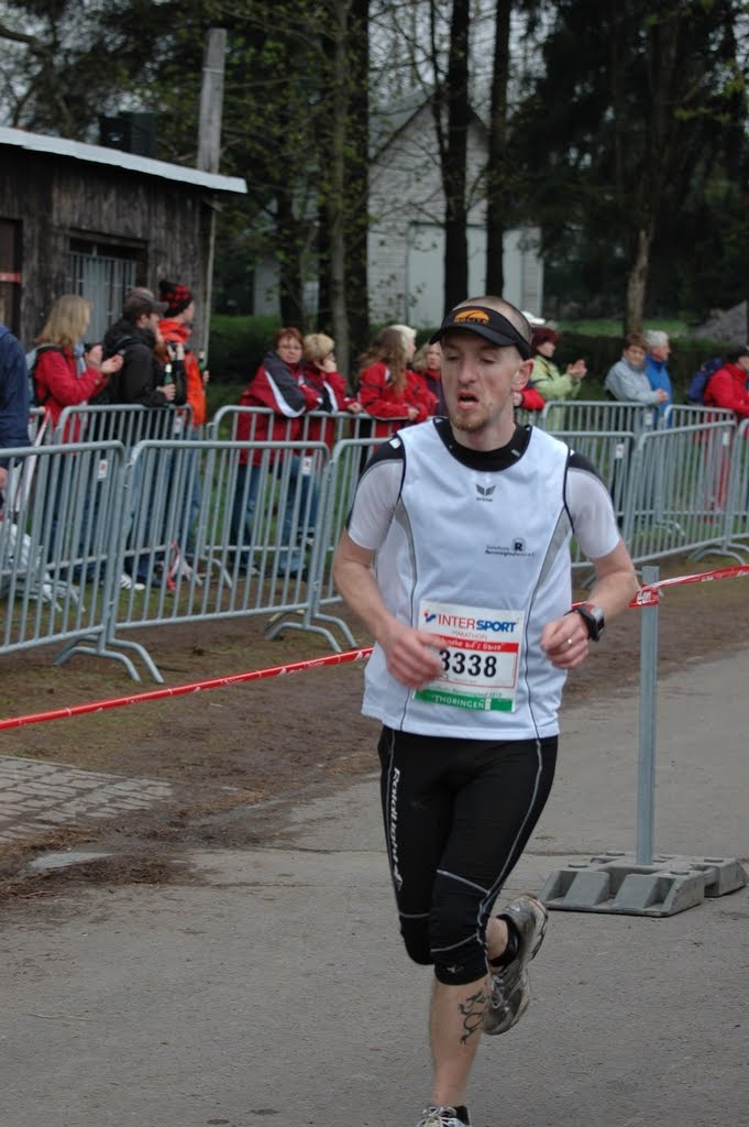 rannte ich durchs Ziel. Endlich! Medaille empfangen und erstmal am Gitter anlehnen. Nochmals Gefühlsausbrüche und dann erstmal ein paar Becher Tee eingeworfen... Nur nicht stehenbleiben oder gar setzen, das wusste ich noch von meinen letzten Marathons (man, das ist schon 6 Jahre her...). Also nochmals zum Berg gegangen und Bekannte Gesichter gesucht aber keines gefunden. Jetzt wurde es auch richtig kalt und somit ab zur Gepäckwiese und erstmal Alex anrufen, der jetzt an der Marathonmarke stand und versuchte den Mann von Mikatiming zu bestechen, ob ich durch bin oder nicht... Dann umziehen. Jetzt traf ich Ronald, der den SM in 6:04 finishte (Gesamt-20.) und eine bibbernde Manu (Gesamt-13. und AK-2. beim SM 7:06). Köstritzer reingeplumpt und der Versuch, eine Bratwurst zu essen - wie immer: geht nicht. Dirk nochmal getroffen, sowie endlich auch Alex und Susi sowie alte Läuferbekanntschaft aus der Heimat. Dann folgte der einzige Makel des Tages: Bustransfer nach Neuhaus (7€ und stehen müssen..., die HMler fahren umsonst...). Dort spuckte der Bus zu 90% nur staksende Zombies aus. Ich zählte diesmal nicht dazu: keine Probleme und auch heute ist das Treppensteigen fast kein Thema und selbst zum Fussballspiel im Clarapark reichte es heute schon! Also, alles richtig gemacht! Und auch für den Verein ein wirklich erfolgreicher Tag, denn neben den bereits erwähnten Resultaten erzielte Jörg einen fantastischen 4.Gesamtrang beim Supermarathon (5:32, das wäre Platz 2 letztes Jahr geworden) und Alex lief beim Halben seine angekündigte 1:30er Zeit.Abschließend noch vielen herzlichen Dank an meine Familie, die oft und lang auf mich verzichten musste während ich durch den Auewald hirschte oder vereiste Cossi-Radwege schlitterte und ein fettes Dankeschön an meine Vereinskameraden, die mich bei vielen Läufen begleiteten, mich zu neuen Bestzeiten zogen und mir vor allem auch Mut zusprachen! DANKE!!!