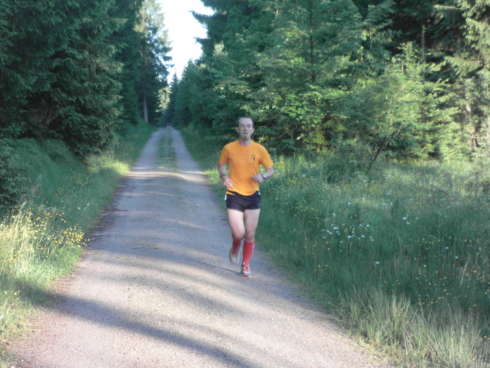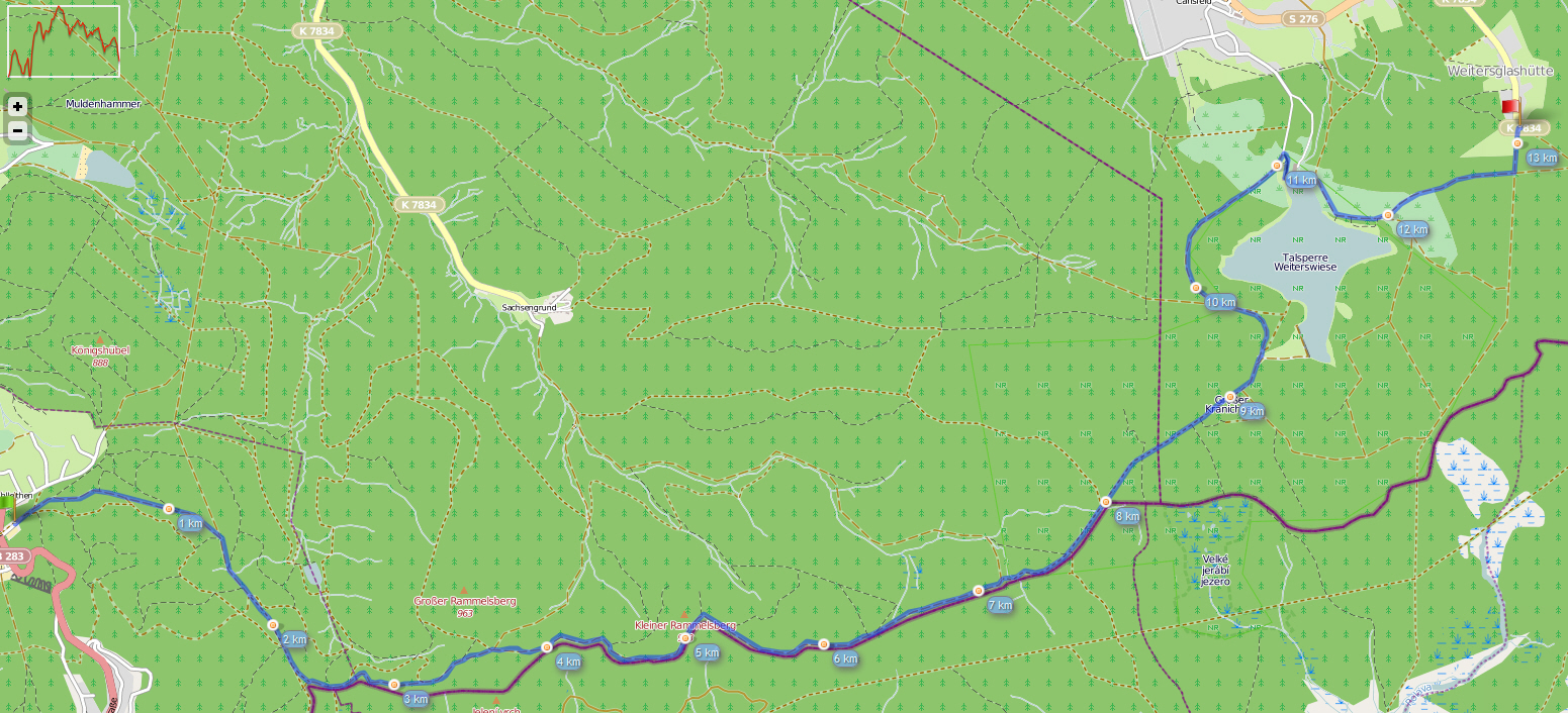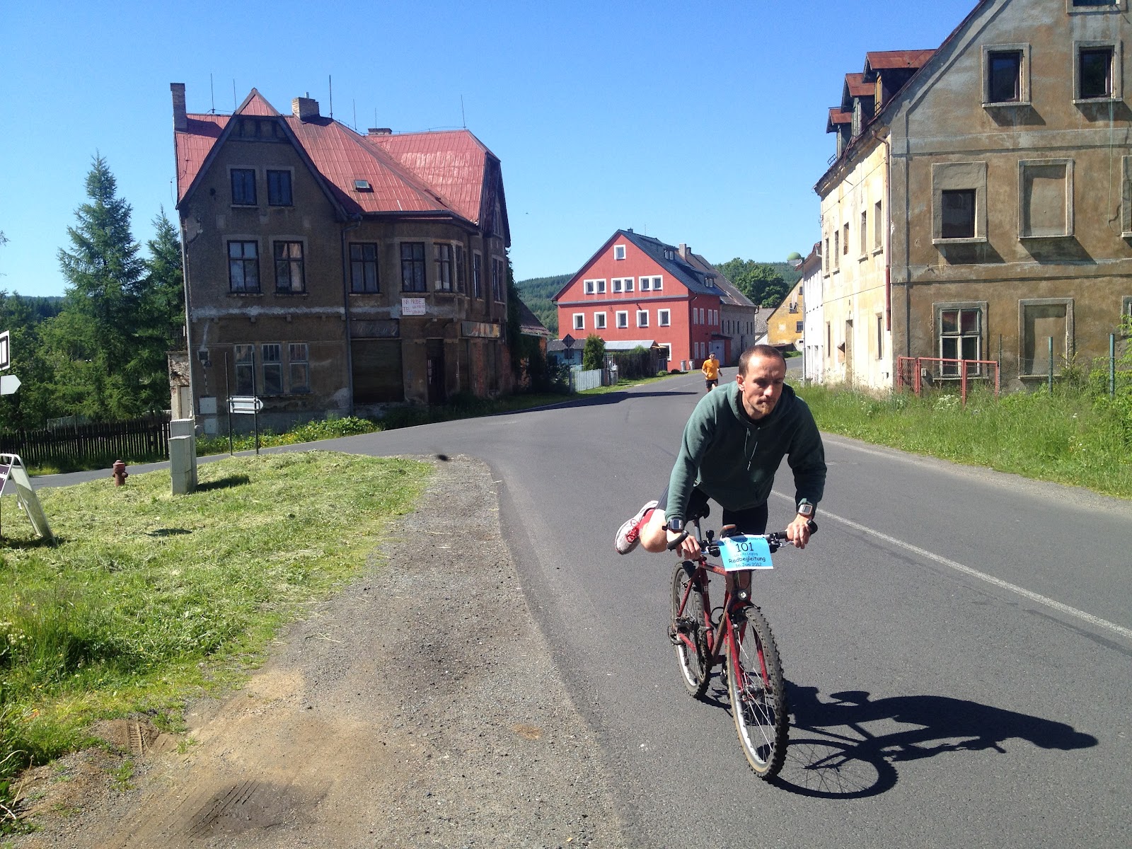 Auf dem Keilberg schwang ich mich dann wieder aufs Rad um gleich die nächste Etappe (18km) Marcus zu begleiten. Auch dessen Etappe kannte ich gut da ich diese bereits selbst 2x gelaufen war. Alles lief gut und Marcus machte einen guten Eindruck. Da ich wußte, dass die Teamkollegen mit Getränken in Tschechien stehen werden, war es auch nicht so dramatisch, dass ich die kleine Wasserflasche verloren hatte. Das Drama folgte dann später... Kaum waren die Kollegen aus Sichtweite verschwunden, ging es mit Marcus körperlichem Zustand rapide bergab. Eine 20-minütige Pause am Vorgarten eine sehr freundlichen Dame brachte dann wieder Besserung. Zumindest soviel, dass wir irgendwann weitergehen konnten. Doch bis zum Aufbruch gab es erstmal Wasser, Salz, Brot, Schokolade, Traubenzucker... Ich hätte bestimmt auch ein Budweiser bekommen; hätte halt nur fragen müssen... Aber solche Tage gibts halt und die passieren und sind auch nicht so schlimm. Gesundheit geht vor und ich war froh, dass Marcus einigermaßen heil am Grenzübergang Jöhstadt ankam. Unsere Mannen um Alex, Matthi und den noch starten wollenden Steffen, Ronald, Thomas und André hatte sich doch schon Sorgen gemacht.