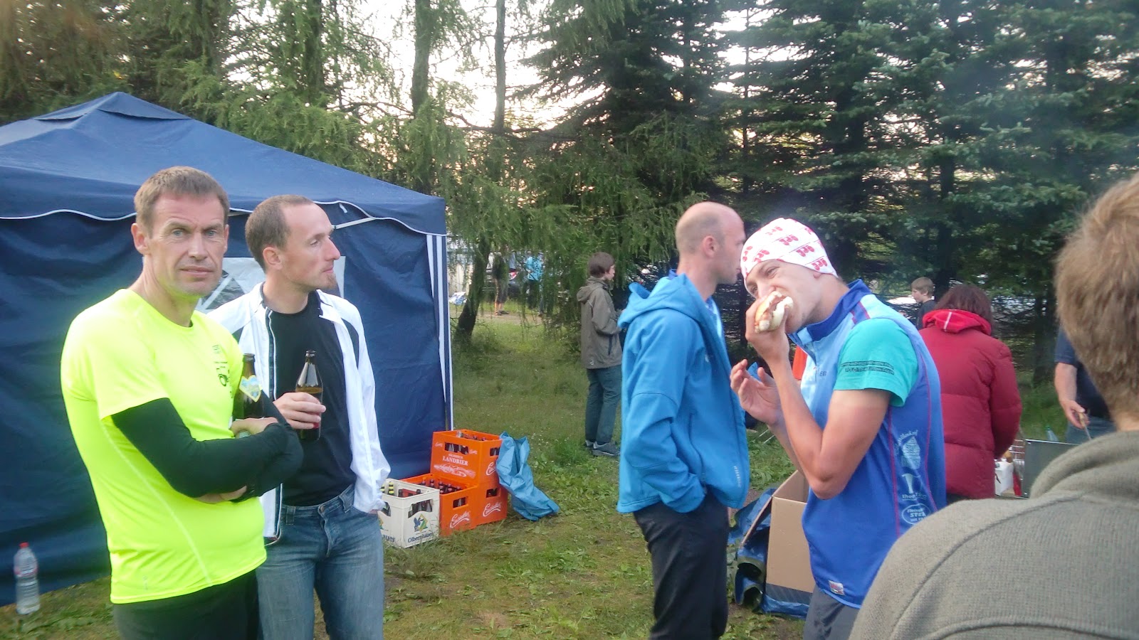 Freitagabend angereist, geschwatzt, hoch- und tiefgestapelt, Mut angetrunken und irgendwann im zelt (bzw. Bus) verschwunden denn die Nacht in Schöneck ist bekanntlich kurz. David durfte traditionell als Erster für unsere Team an den Start (unter der Bedingung, schneller als im letzten Jahr zu sein und keine Rücksicht auf Irrläufer aus anderen Teams, gestürzte Konkurrenten oder nachtwandelnde vogtländische Schönheiten zu nehmen). Wir hatten aber nicht mit der überragenden Laufstärke der Eingeboren gerechnet und somit bekam unser Team gleich mal gehörigen Rückstand aufgebrummt... Wir hatten mit 5 Minuten gerechnet, vielleicht auch 8, aber dass es dann gleich mal 13min waren, hui....! David kam 5:04 uhr aus dem Wald geprescht und übergab mir an Position 2 liegend den Kochlöffel. Ich flitzte also los. Links ne GPS-Uhr, rechts ne GPS-Uhr: da sollte zumindest was den Streckenverlauf angeht nix passieren. Abstand nach hinten wußte ich nicht, aber daran sollte man sich eh nicht orientieren. Mein virtueller Gegner Kai von den Hermsdorfern war aber schon 2-3km weiter als ich und somit musste ich wenigsten versuchen, weiteren Schaden gering zu halten. Zwischenzeitlich piepste die Uhr und zeigte km-Splits zwischen 4:10 und 5:54min/km an. Fast 6min? Ja, da war halt so ein kleiner Anstieg... Alex meinte noch ich solle dort auf keinen Fall gehen (obwohl er selbst gehen musste...), bis auf letzten 30m habe ich das auch hinbekommen. Danach wellig weiter. Bei herrlichem Sonnenaufgang! Die Etappe ist wirklich toll: sowohl vom Verlauf her (am Ende gehts über die Staumauer) als auch von der Startzeit (gegen 6 Uhr ist man fertig und kann den Rest des Tages "genießen"). 6:07 Uhr konnte ich dann (weiterhin auf 2 liegend) auf Jörg wechseln der jetzt über den Auersberg musste.